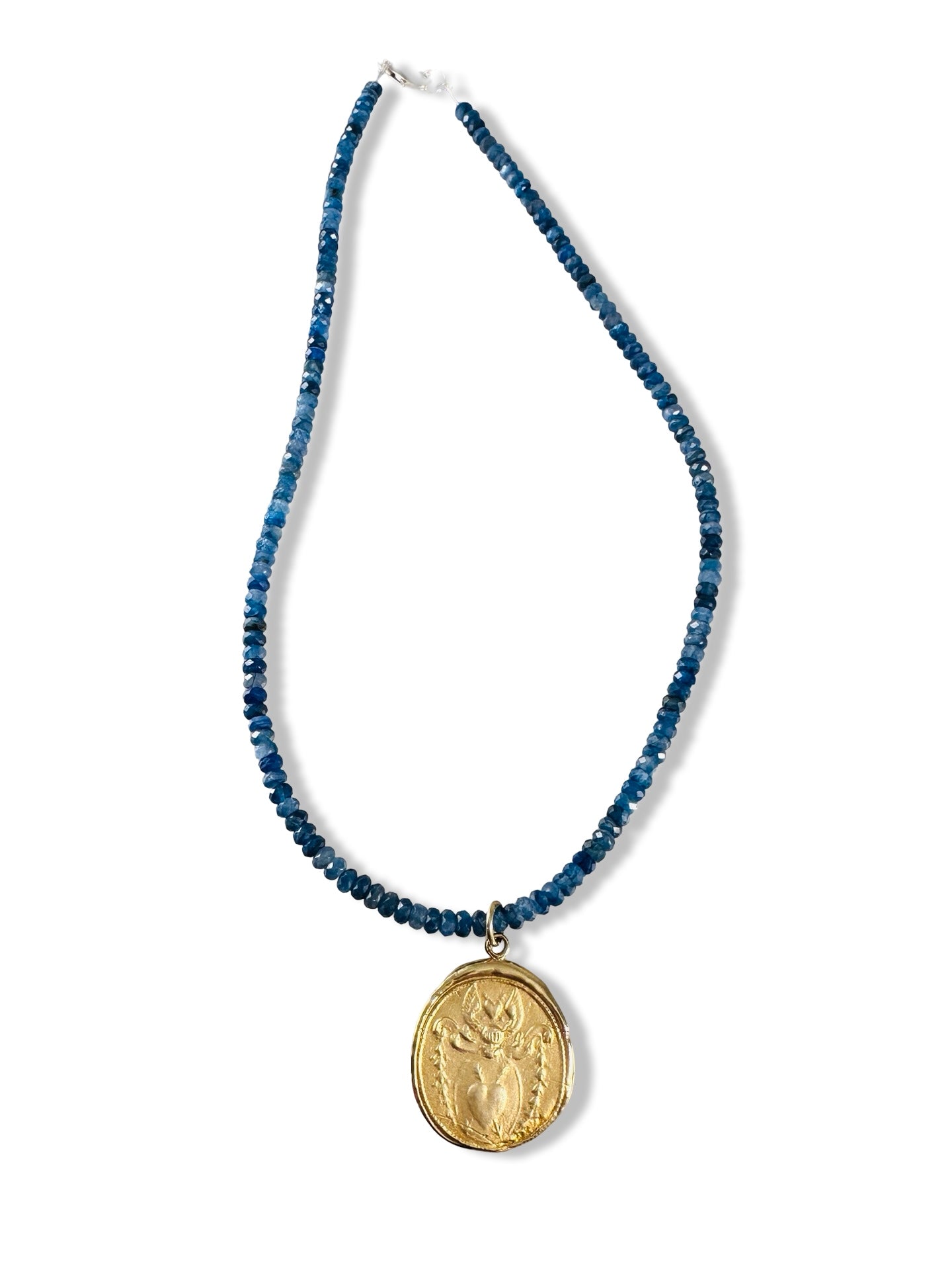 The pendant is gold plated over sterling silver. Hand strung on a 16 inch strand of Kyanite faceted gemstones.