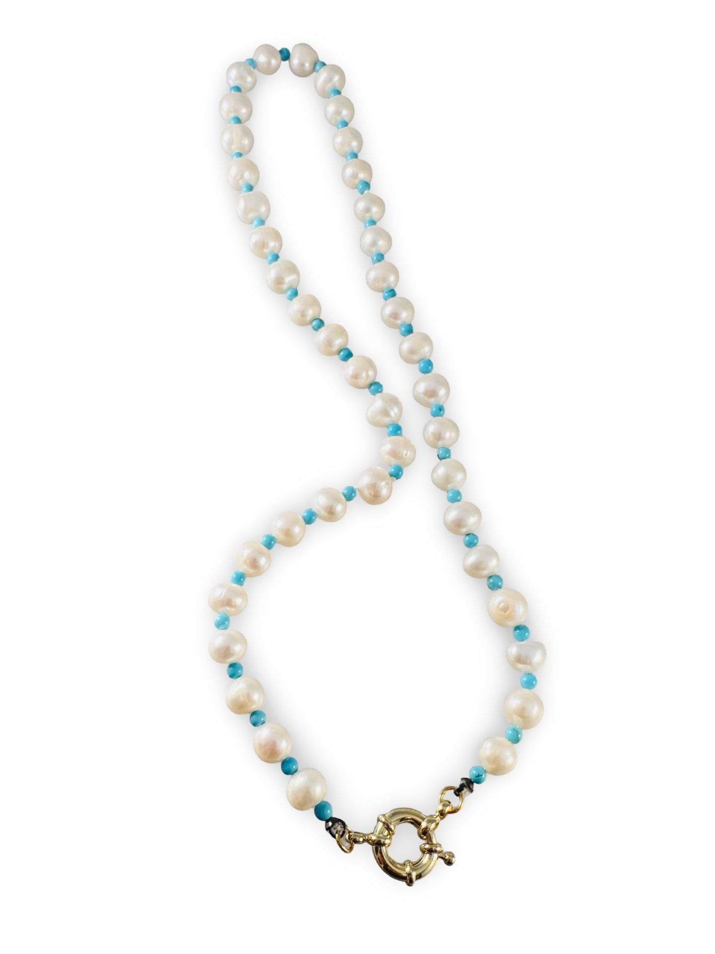 18” Large White Pearl with Turquoise gem beads, gold filled charm clasp.